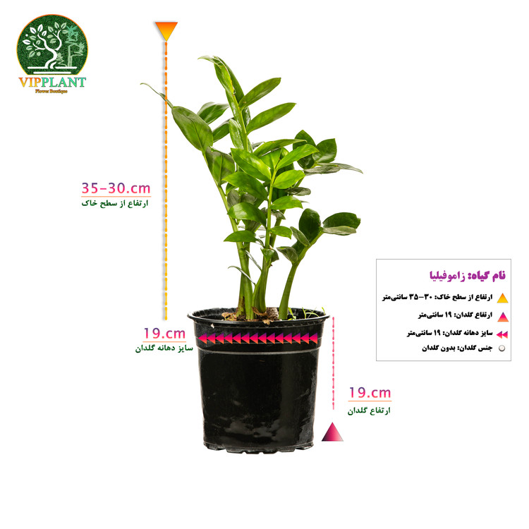 ارتفاع از سطح خاک 30-35 سانتیمتر، ارتفاع گلدان 19 سانتیمتر، قطر دهانه گلدان 19